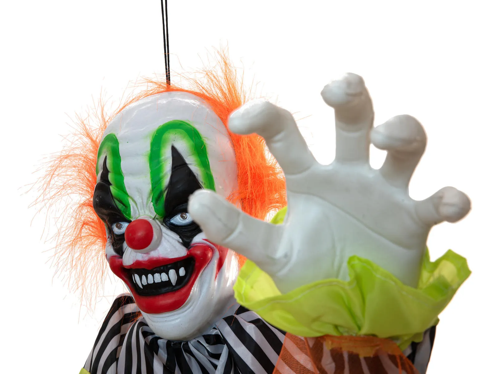 Curby stands motionless, his arms outstretched as if waiting for his next victim. As soon as someone gets too close, he comes to life. His head and arms twitch ominously, while a chilling laugh and organ music fill the room. Red LED eyes light up, and the atmosphere shifts from uneasy to downright oppressive. The animation is activated via a built-in microphone or a wired switch, subtly hidden behind fleece on the top of the base.