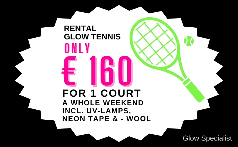 Glow Tennis is extremely popular. It means that a tennis match or tournament is played in the dark, on a tennis court illuminated by black lights (UV lamps). The outline, the ball, the participants, the net, the rackets and any other items light up colorfully. It really is something you have to experience! You cannot compare a Glow tennis match with a 'real' tennis match. Because it is very dark, you only see the ball coming at the last minute and you also see the other players and your own racket less well than normal. It is mainly the funny element that makes it a unique experience. In addition to neon tape and wool, you also need UV lamps.