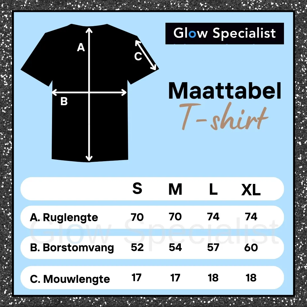 This UV‑reactive blacklight T‑shirt with a colourful Rubik‑style design is a true eyecatcher. Bright in normal light, but under UV light the neon colours transform into an intensely glowing fluorescent effect. Perfect for neon parties, glow parties, festivals, carnival and themed events. The unisex 100% cotton fit is comfortable and ideal for anyone who loves playful and colourful neon fashion.