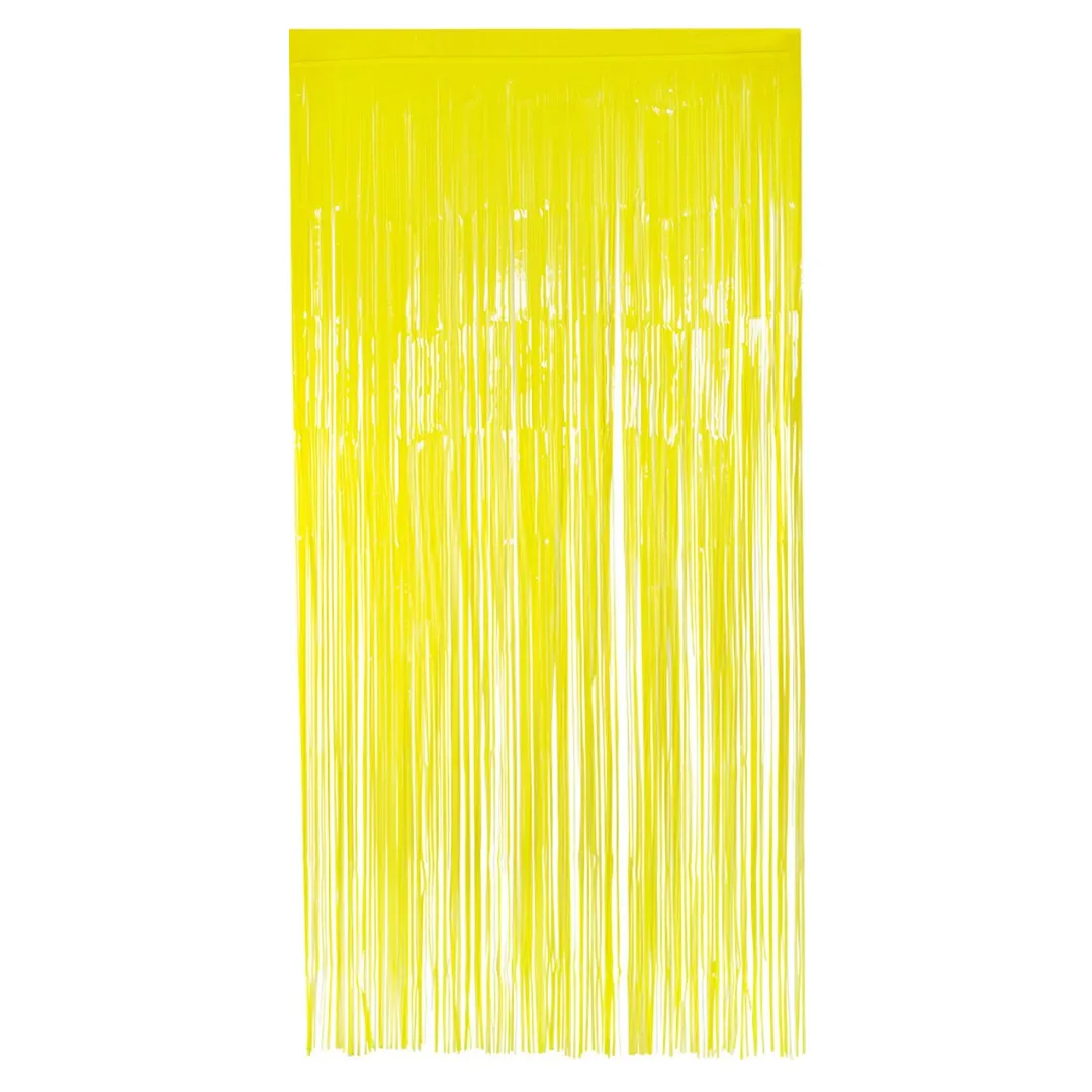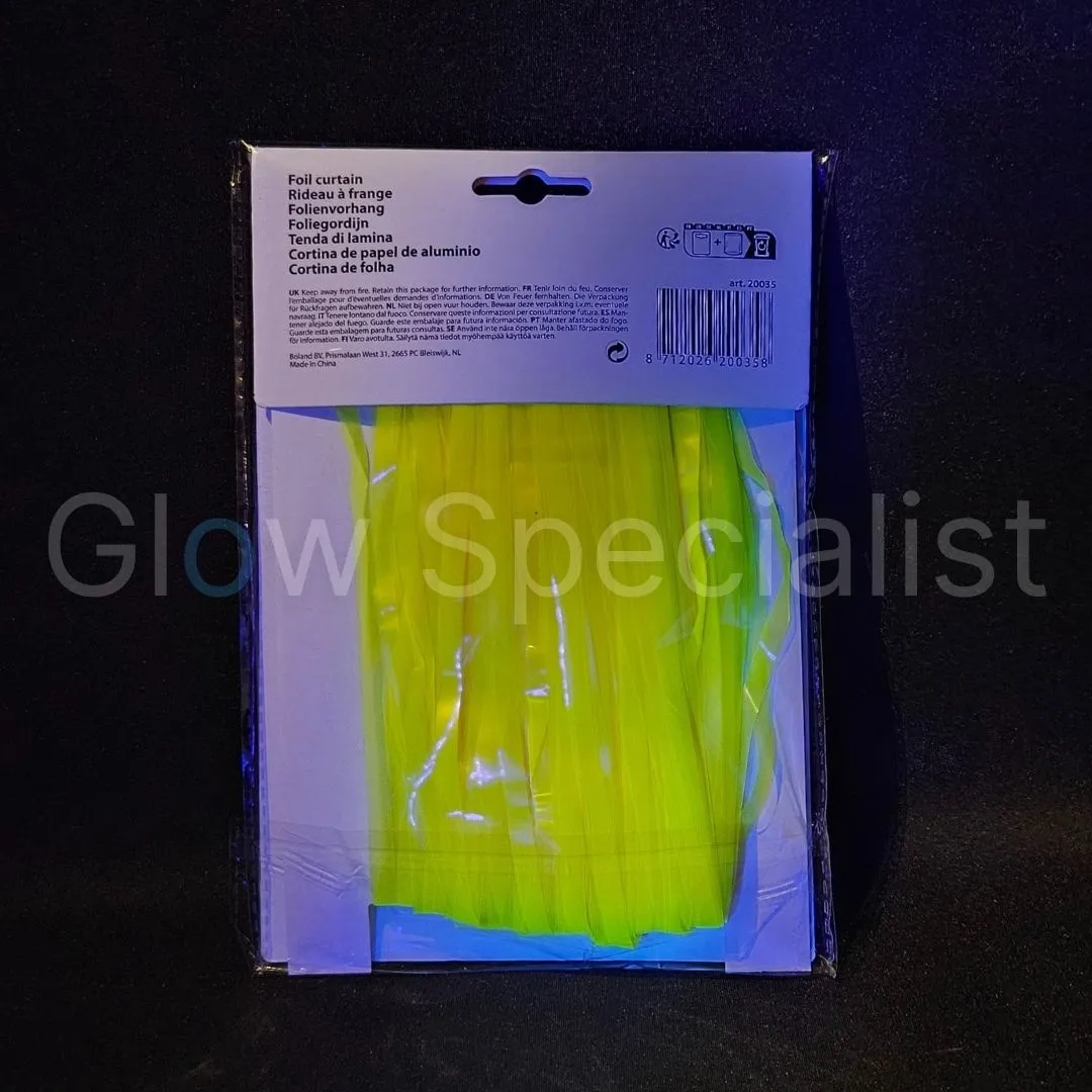 Festive foil curtain in the color neon geel. Because the curtain lights up with UV (blacklight), it is a nice addition to a Glow party or neon party. Size 2 x 1 m. Also suitable as party decoration at a birthday, wedding or school party. Hang the curtain in a doorway and let the guests or the birthday girl step through the many strings.