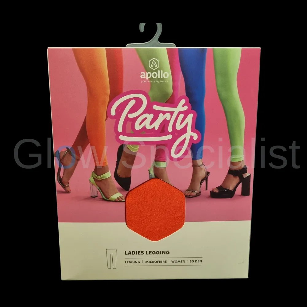 Good quality fluor orange tights comfortable and feels very pleasant. This legging is very elastic. Thickness: 60 denier. In blacklight the legging starts to glow. Great for a neon party or glow event.