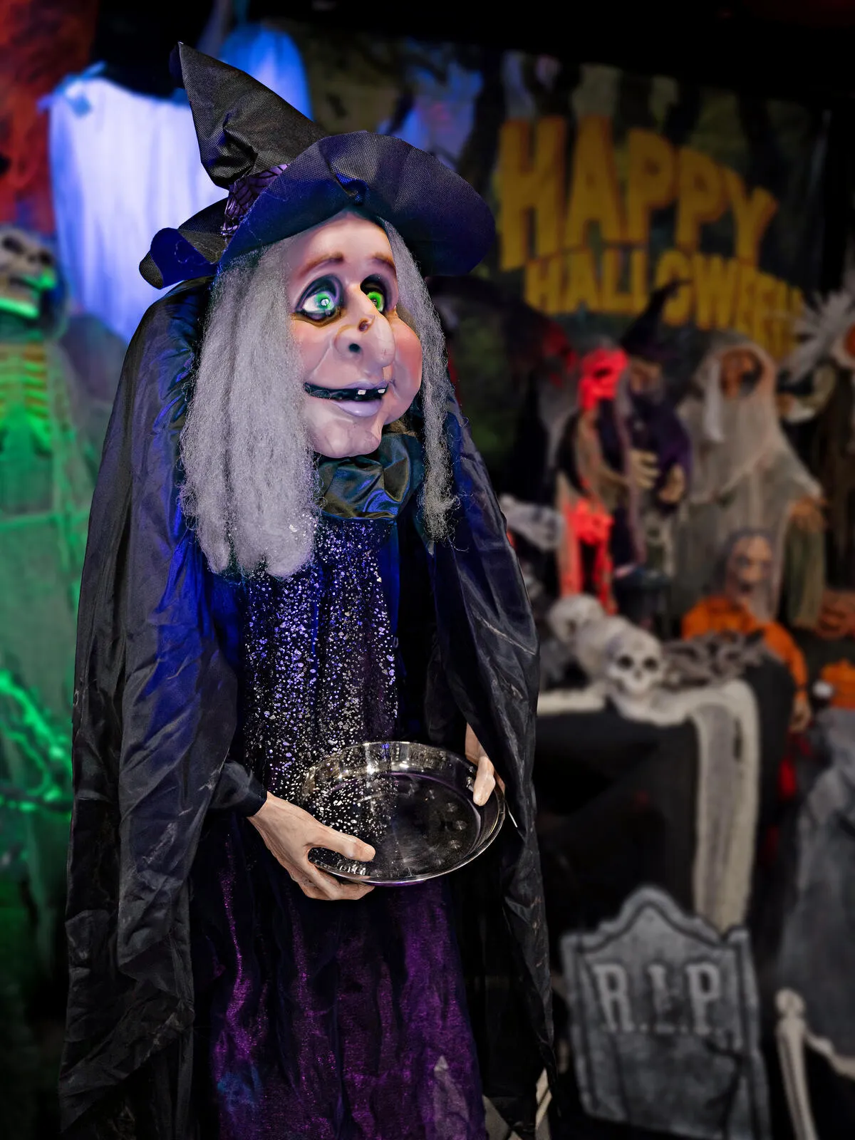 She shouts all sorts of things... but no one listens. Witch Marie is mysterious, imposing, and downright terrifying. With her blinking eyes, swaying torso, and eerie voice, she's a dark presence that both enchants and disrupts your Halloween decorations.