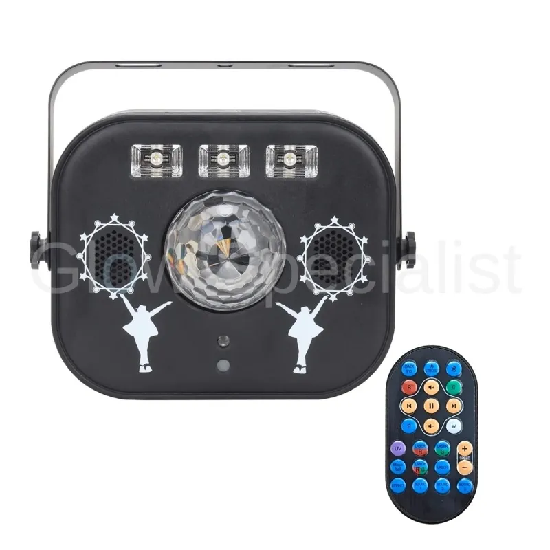 Tevens wordt er een afstandsbediening meegeleverd waarmee de diverse functies kunnen worden bediend. Wat wij onwijs fijn vinden is dat er 3 automatische programma's in zitten, maar dat je ook elk effect apart aan kan zetten. Heb je dus blacklight nodig dan zet je die aan. Volgende keer alleen een strobo nodig dan kan dat ook etc.