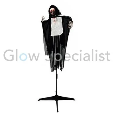 Dit terwijl hij zeer irritant lacht! Hang 'm op bij een Halloweenfeest of sprooktocht, zodra er een luid geluid klinkt gaat de geest bewegen. Je kunt de geest ophangen, of als je zelf een statief hebt neerzetten.