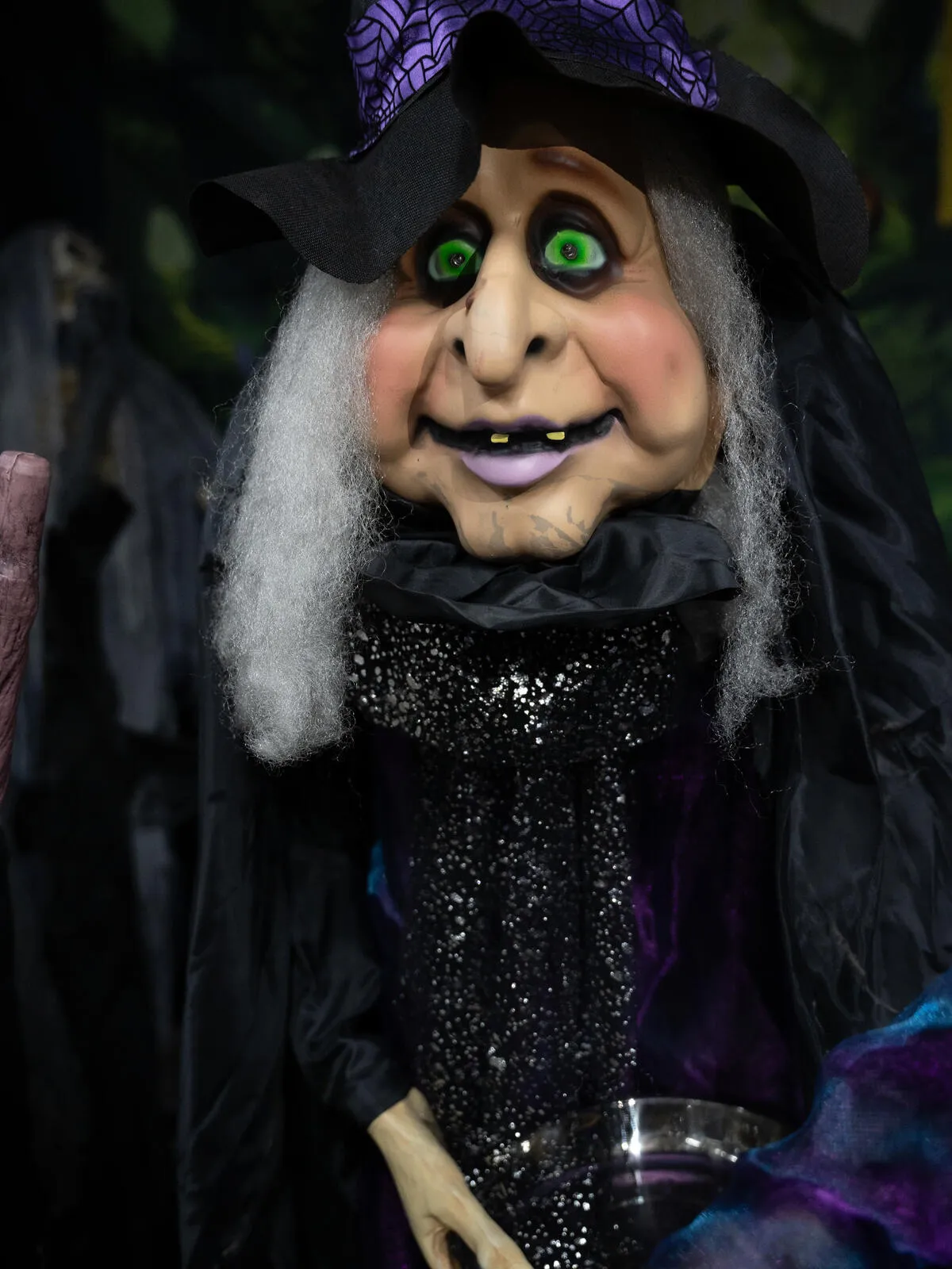 Een heks met een missie: jouw Halloweenfeest betoveren én laten gillen van angst. Witch Marie is een imposante, geanimeerde figuur van maar liefst 180 cm hoog. Haar donkere mantel, puntige hoed en rode ogen maken haar tot een angstaanjagende verschijning. Tijdens de animatie schudt haar hoofd en knipperen haar ogen hel rood, terwijl haar opmerkingen de sfeer compleet maken.