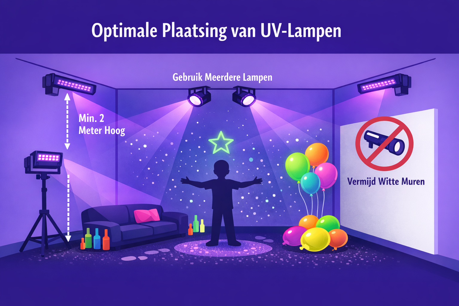 • Combineer UV‑lampen met UV‑reactieve decoratie.