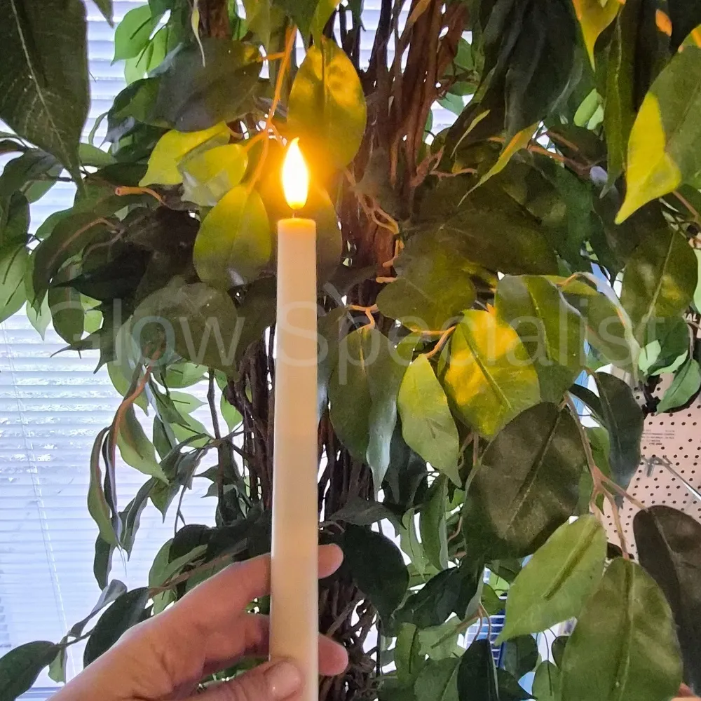 De vlam van de kaars is bijna niet van echt te onderscheiden waardoor de kaarsen een goed en veilig alternatief zijn voor echte dinerkaarsen. En met meer dan 500 branduren zijn de kaarsen zuinig in verbruik. Deze kaarsen set is er ook in een standaard variant met ronde vlam en een deluxe met puntige vlam in wit en ivoor. Alle kaarsen hebben dezelfde soort afstandsbediening