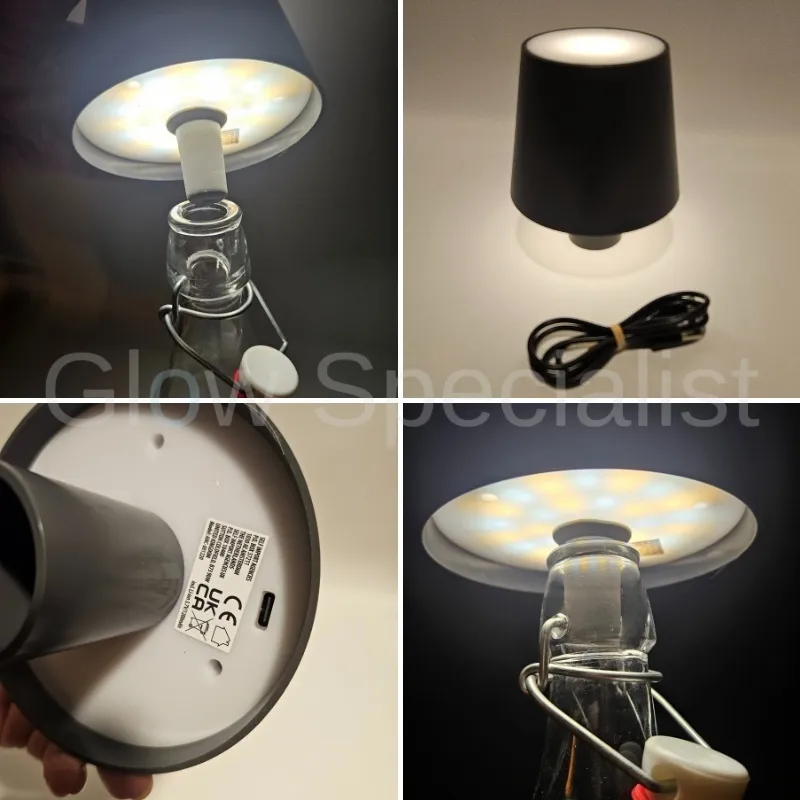 Het grote voordeel van deze flessenlamp is dat hij oplaadbaar is en dat het kabeltje wordt meegeleverd. Volledig opgeladen brandt het lampje ca. 4-6 uur, afhankelijk van de lichtsterkte. Want ook die kun je aanpassen door het lampenkapje bovenop wat langer aan te tikken.