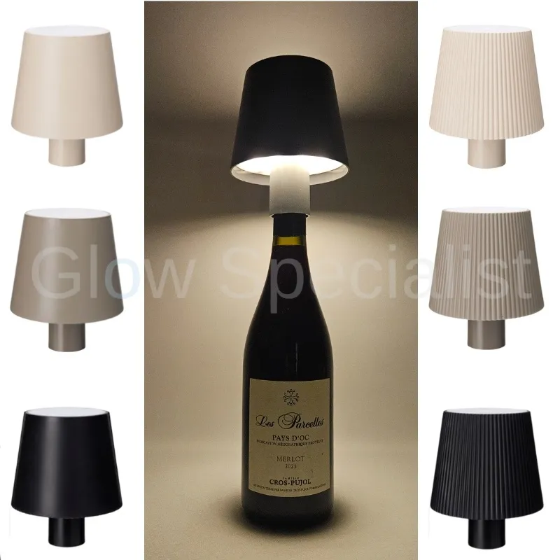 Je hoeft de fles niet eens eerst leeg te drinken want er zitten twee doppen bij om het lampenkapje te plaatsen, een smalle voor in de flessenhals en een bredere om eroverheen te plaatsen. Dit maakt het een perfect product om cadeau te geven bij bijvoorbeeld een goede fles wijn.