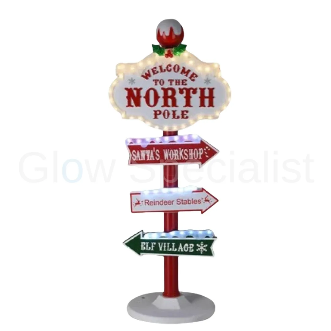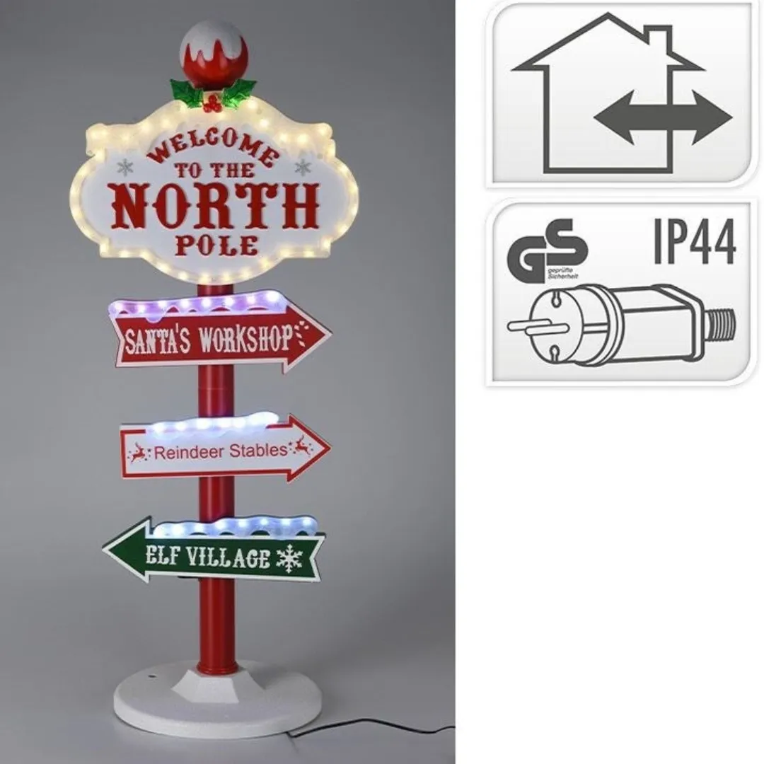Welkom op de Noordpool! Deze mooie wegwijzer met LED verlichting is een aanwinst voor je kerstdorp, kerstmarkt of kerstvoorstelling. Deze originele kerst wegwijzer is 95 cm hoog en voorzien van 59 LEDs.