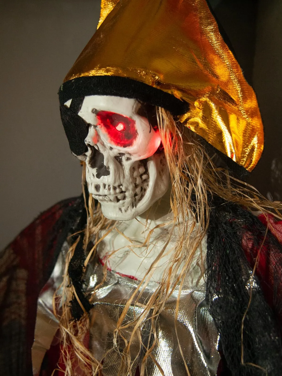 Deze angstaanjagende piraat is klaar om je Halloweenfeest te enteren. Met zijn levensgrote formaat van 170 cm, knipperende rode ogen en griezelige geluidseffecten is deze hangende Halloweenfiguur van EUROPALMS een echte blikvanger. Perfect voor spookhuizen, themafeesten en winkelpresentaties.