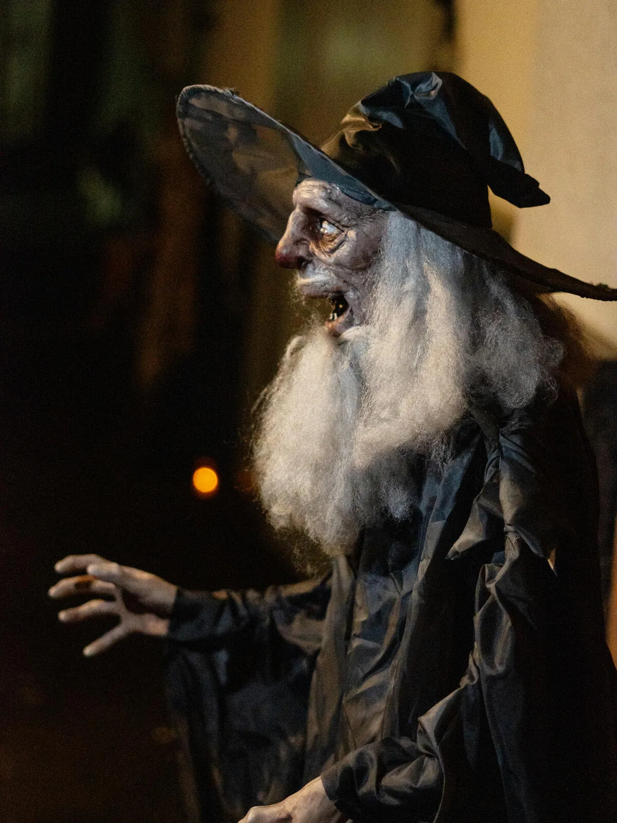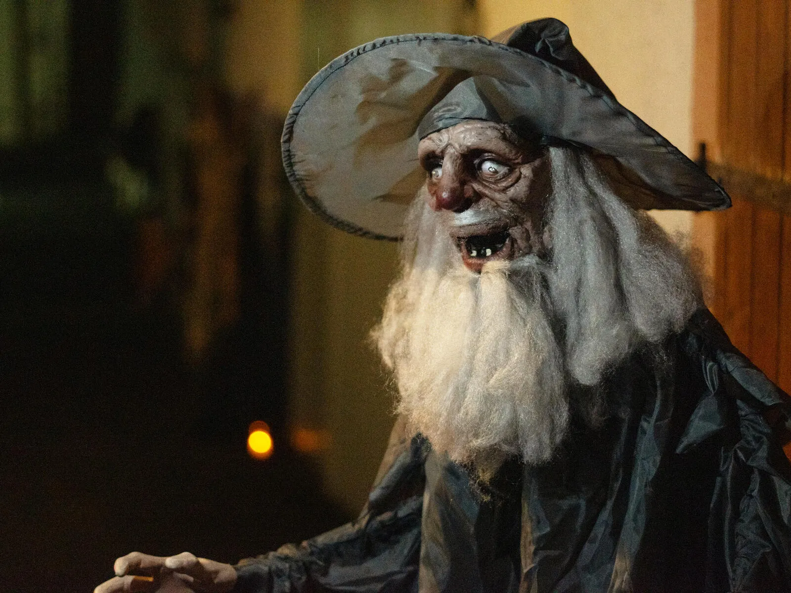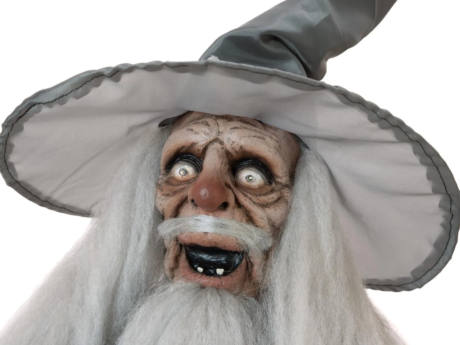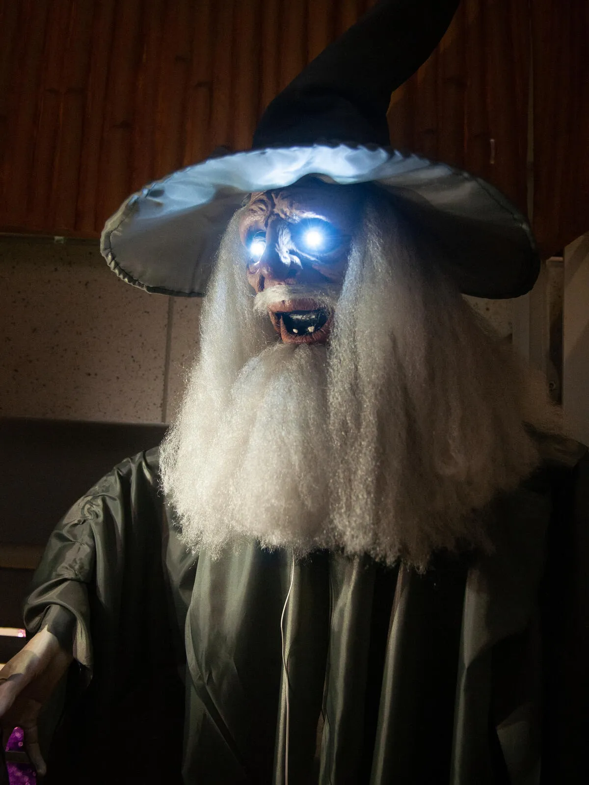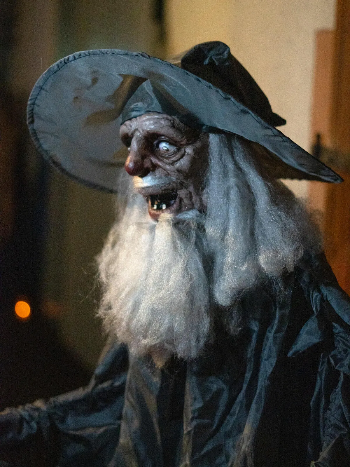 Deze tovenaar staat met zijn lange grijze haar, compleet met tovenaarshoed. Met zijn bijna tandloze gebit en vele rimpels kan je zien dat het een oude tovenaar is. Tijdens het effect gaan zijn grote ogen licht geven en beweegt zijn lichaam van links naar rechts terwijl er een spookachtig geluid klinkt. Het effect wordt geactiveerd door geluid of de schakelaar.