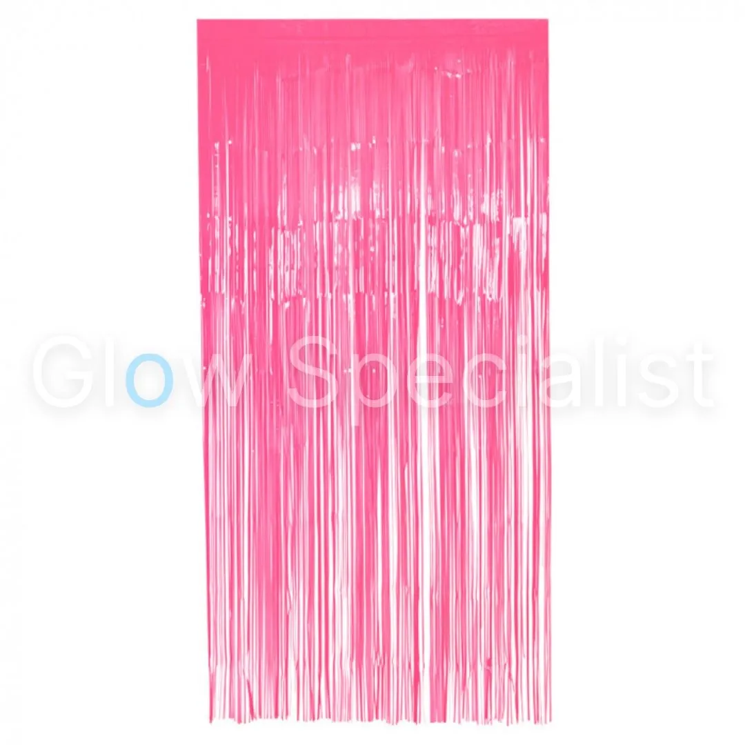 Feestelijk foliegordijn in de kleur neon roze. Omdat het gordijn oplicht bij UV (blacklight) is het een mooie toevoeging op een Glow feest of neon party. Afmeting 2 x 1 m. Ook geschikt als feestdecoratie op een verjaardag, bruiloft, of schoolfeest. Hang het gordijn in een deuropening en laat de gasten of de jarige door de vele sliertjes heen stappen.