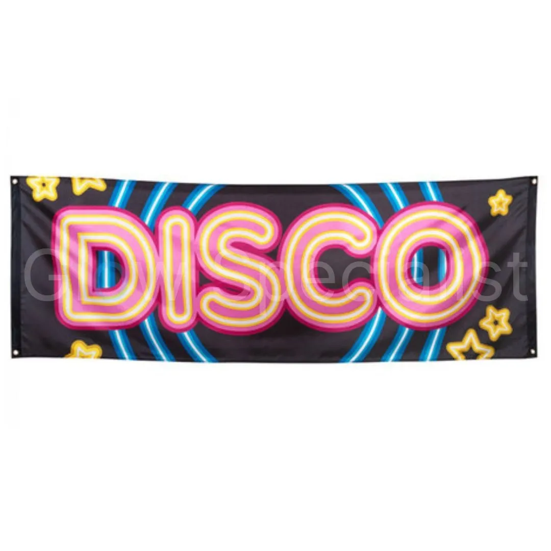 Disco feest of Glow party? Met deze banner in jaren 70 thema vul je de hele ruimte. De zwarte banner met de tekst Disco is 220 x 74 cm. De tekst en sterren lichten op bij UV-licht.