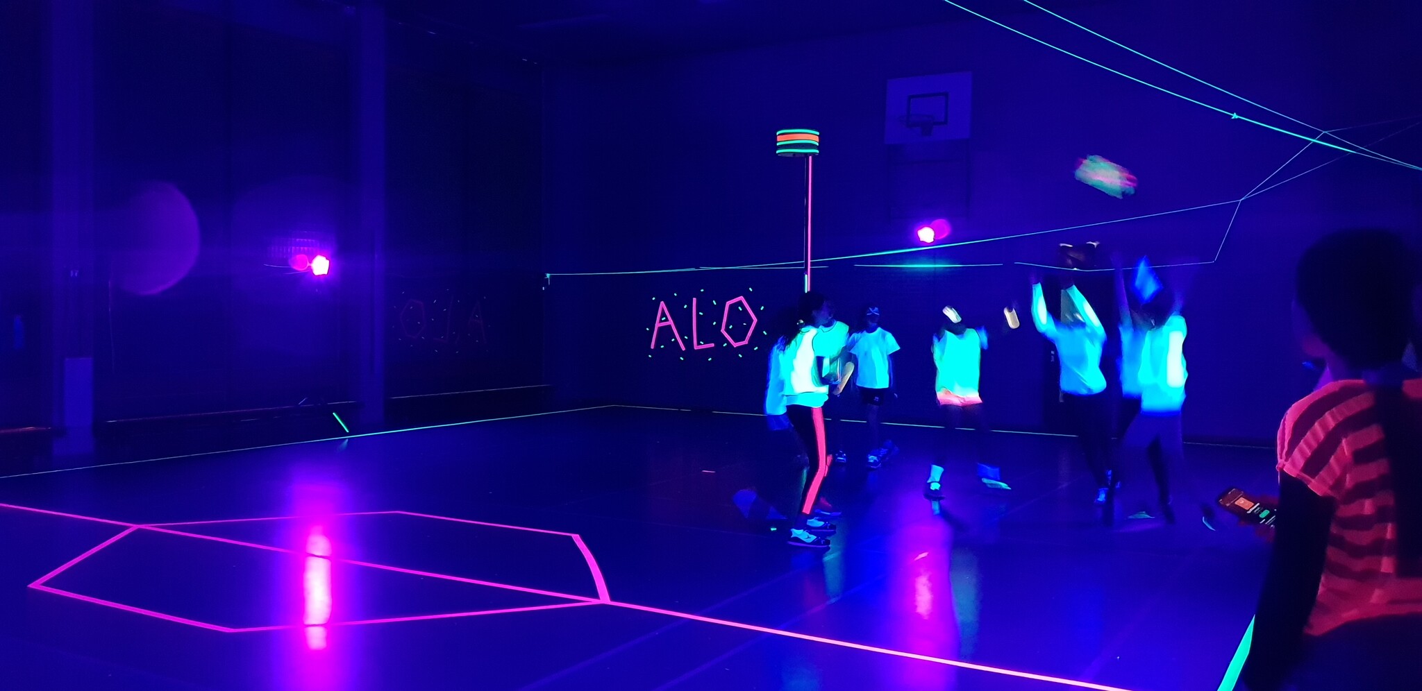 Markeer de lijnen, de palen en de korven met UV neon tape zodat ze goed oplichten bij UV licht. Vraag of de spelers witte of neon kleurige kleding aan trekken en zorg dat de zaal goed donker is. Gebruik een neon kleurige bal (die oplicht bij UV) of markeer een gewone korfbal met UV neon tape.