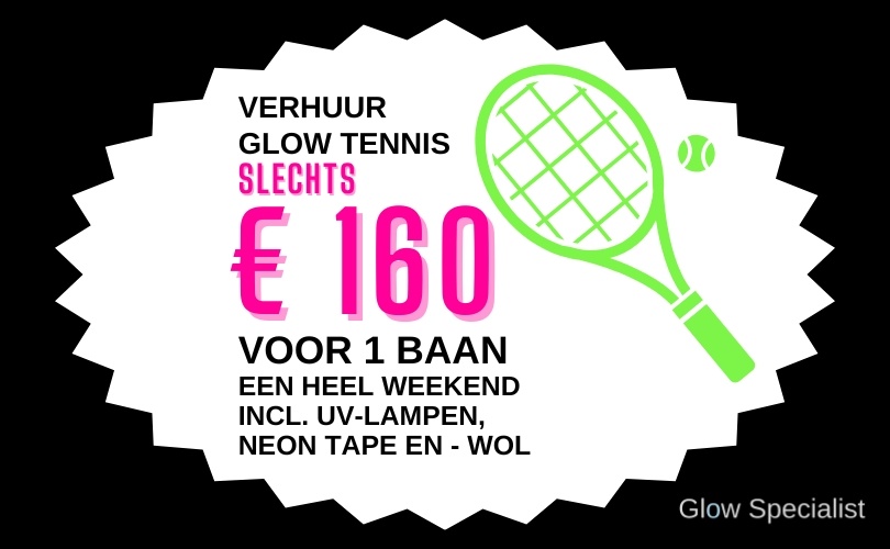 Glow Tennis is enorm populair. Het houdt in dat een tenniswedstrijd of -toernooi wordt gespeeld in het donker, op een tennisbaan die verlicht is door blacklights (UV-lampen). De omlijning, de bal, de deelnemers, het net, de rackets en eventuele andere items lichten daarbij kleurrijk op. Het is echt iets wat je moet ervaren! Een Glow tenniswedstrijd kun je niet vergelijken met een ‘echte’ tenniswedstrijd. Doordat het erg donker is, zie je pas op het laatste moment de bal aankomen en ook de andere spelers en je eigen racket zie je minder goed dan normaal. Het is vooral het grappige element wat het een unieke ervaring maakt. Naast neon tape en wol heb je natuurlijk ook UV-lampen nodig.