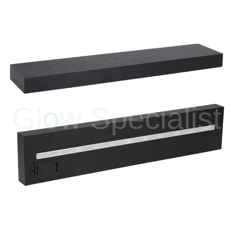 Moderne wandplank in zwart MDF met aan de onderkant witte LED verlichting. Hang 'm op in je woonkamer, slaapkamer of keuken, op een plekje waar je wel wat extra licht kan gebruiken en plaats er wat leuke spulletjes op. Deze wandplank is gemaakt van MDF (zwart met houtnerf) en past in vele interieurs. In de onderkant is witte LED verlichting verwerkt die je met een klein knopje aan- en uit kunt zetten. De wandplank kun je eenvoudig (en onzichtbaar) ophangen met de meegeleverde schroeven.